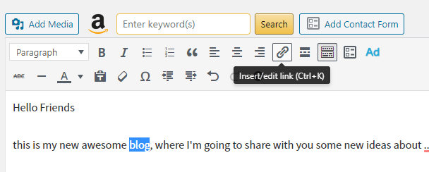 Just highlight the words you want to link by using your mouse, then click the “Add-link” tool.
